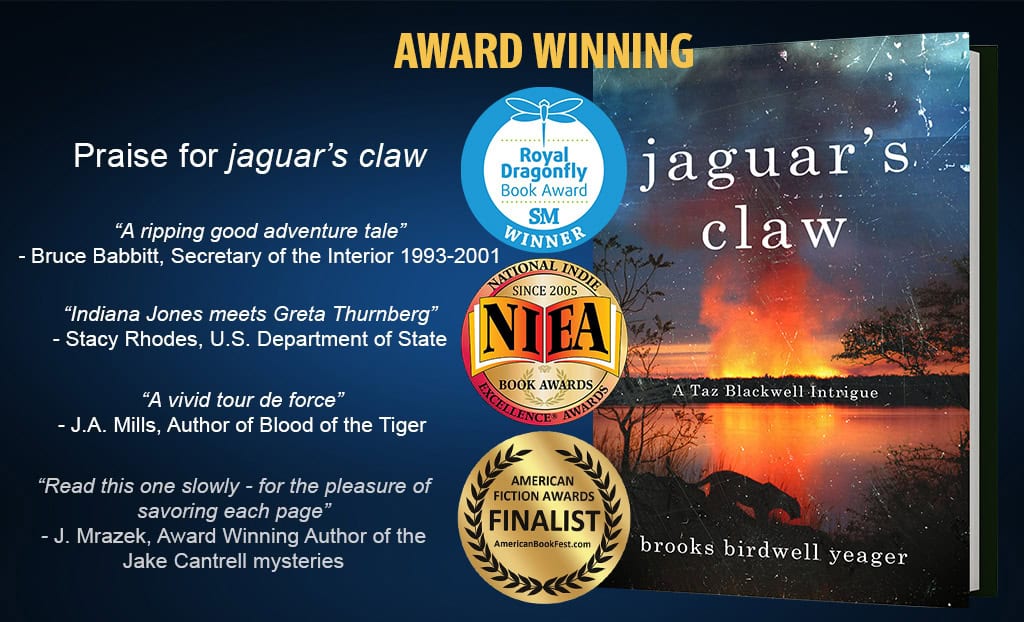 In the Taz Blackwell Series, Brooks Yeager crafts an unlikely hero for our uneasy times. Taz, a former diplomat turned reluctant environmental crusader, drifts between solitude and duty, chasing peace while colliding with power. In Chilly Winds, a quiet island life tangles with global intrigue; in Jaguar’s Claw, the fight moves to the burning Amazon. With lyrical precision and a realist’s bite, Yeager weaves adventure, conscience, and consequence into thrillers that remind us — the planet’s survival is personal.